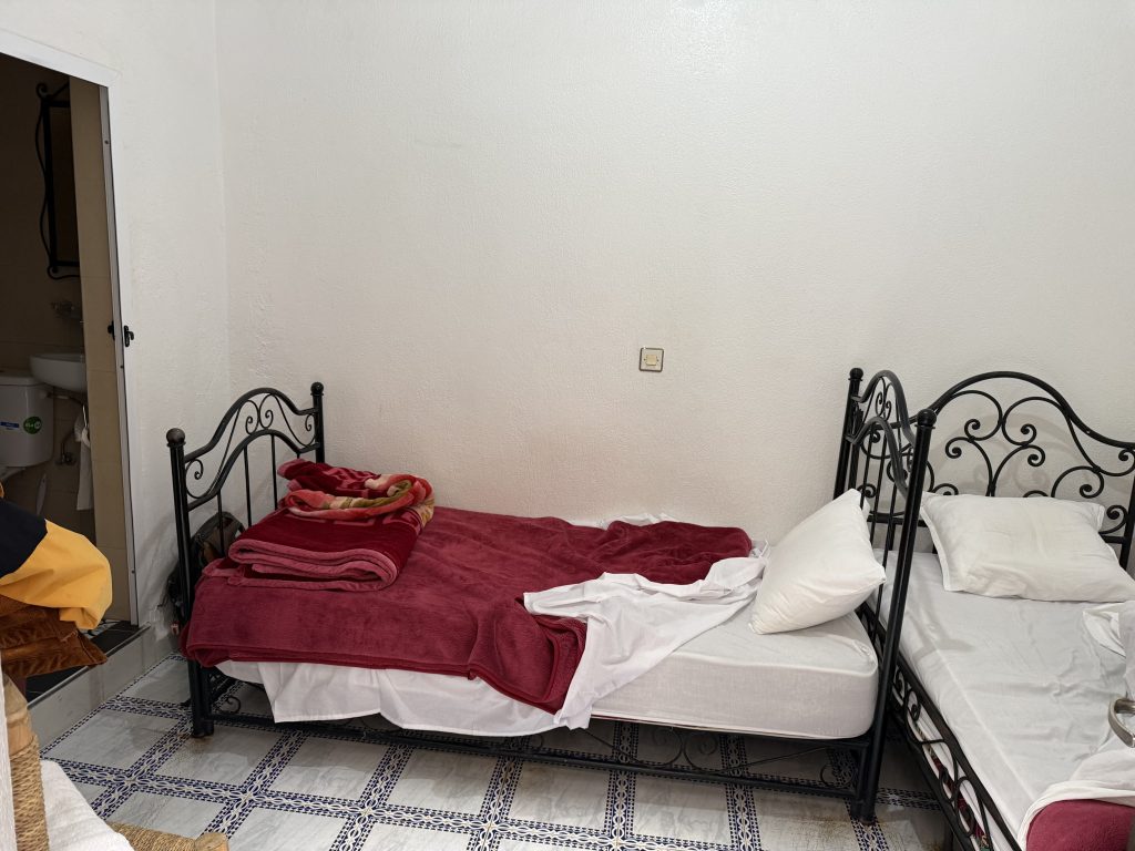 „Zimmer“ ist vielleicht großzügig formuliert: kuschelige vier Quadratmeter, zwei einzelne Betten – mehr passt auch wirklich nicht rein. Aber: ein eigenes Minibad! Eine eigene Toilette, eine eigene Dusche. Luxus in Marrakesch-Edition.