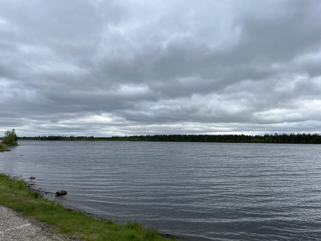 Der Tag endete mit Blick auf den Fluß Kemijoki oder doch Qunasjok, wo unser Stellplatz im Camping Ounaskoski ist.